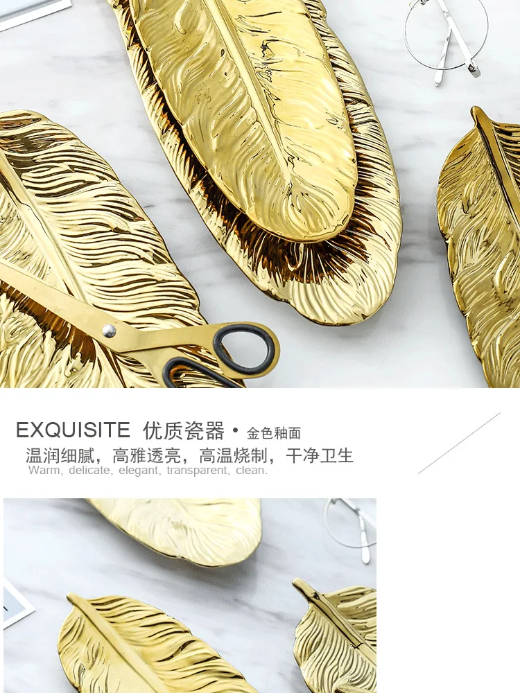 Luxury Ceramic Platter Storage Tray with Glod Rim Green Leaf Glod Feather Jewelry Makeup Brush Storage Decorative Sushi Plate